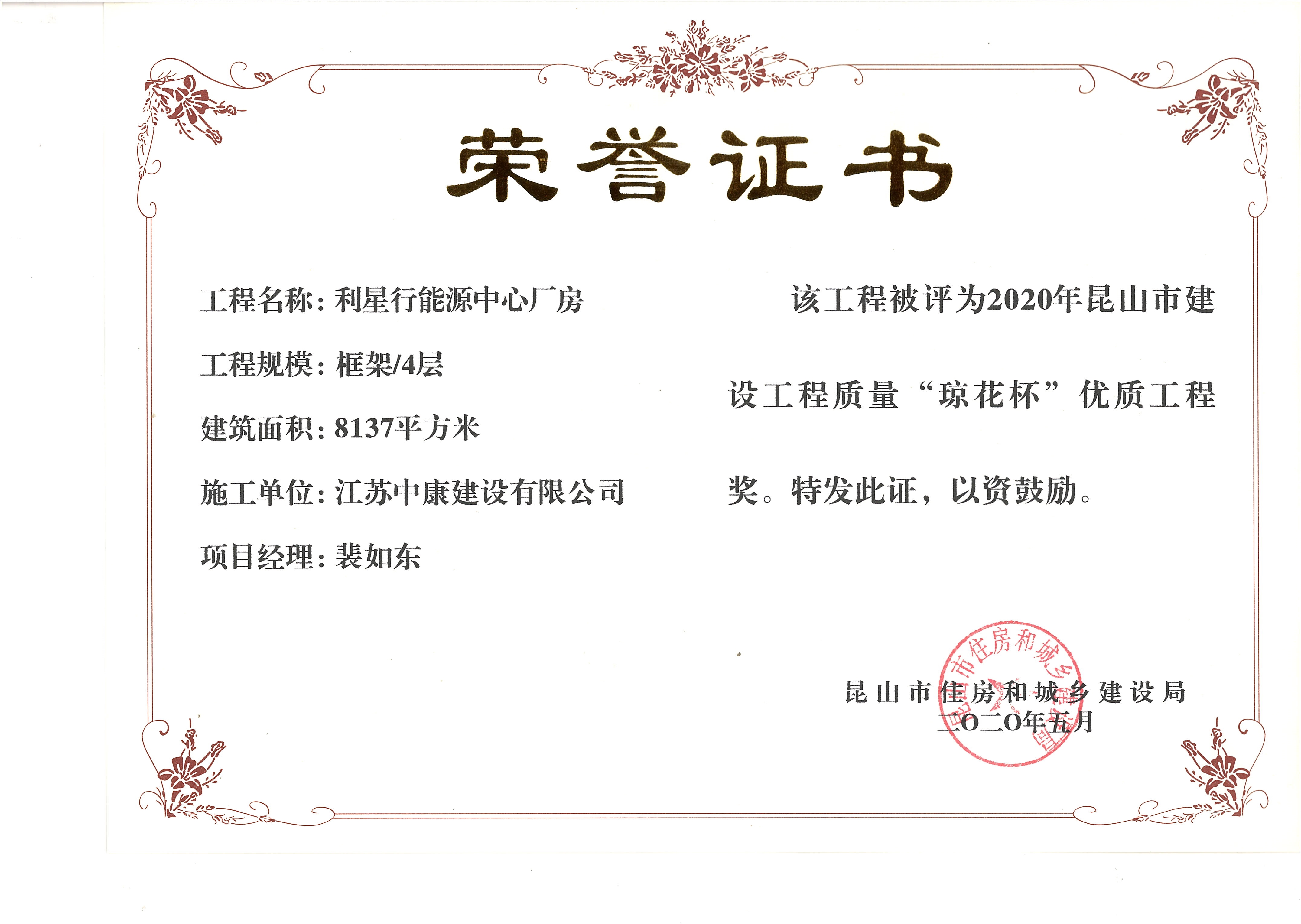 憑借優秀的設計理念和建造品質,該項目由昆山市住建局評定為2020年昆山市建設工程質量“瓊花杯”優質工程獎。