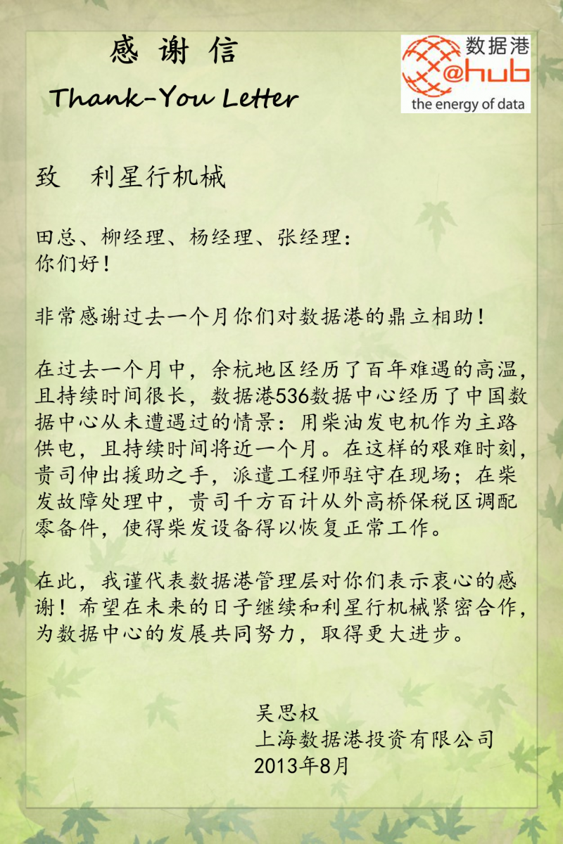 來自上海數據港投資有限公司的感謝信